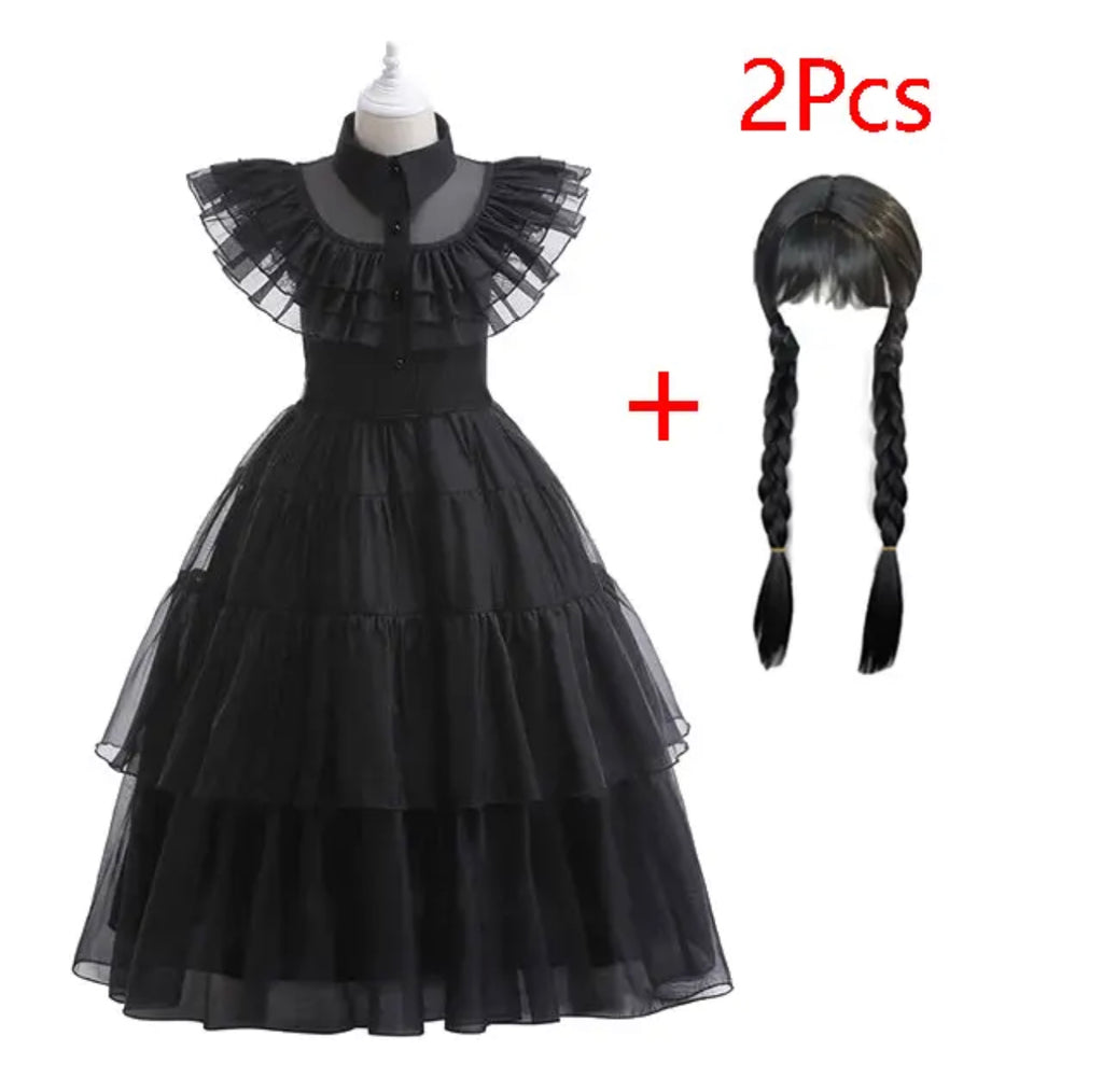 This Wednesday Evening Dress with Wig features a high collar dress and wig inspired by Wednesday Addams from the popular movies and TV series. It's a perfect fit for Halloween or cosplay events.