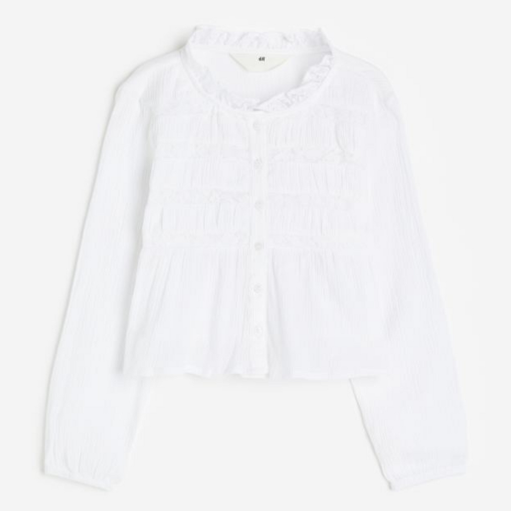 Frill-trimmed stand-up collar, buttons down the front and long sleeves with narrow elastication at the cuffs.