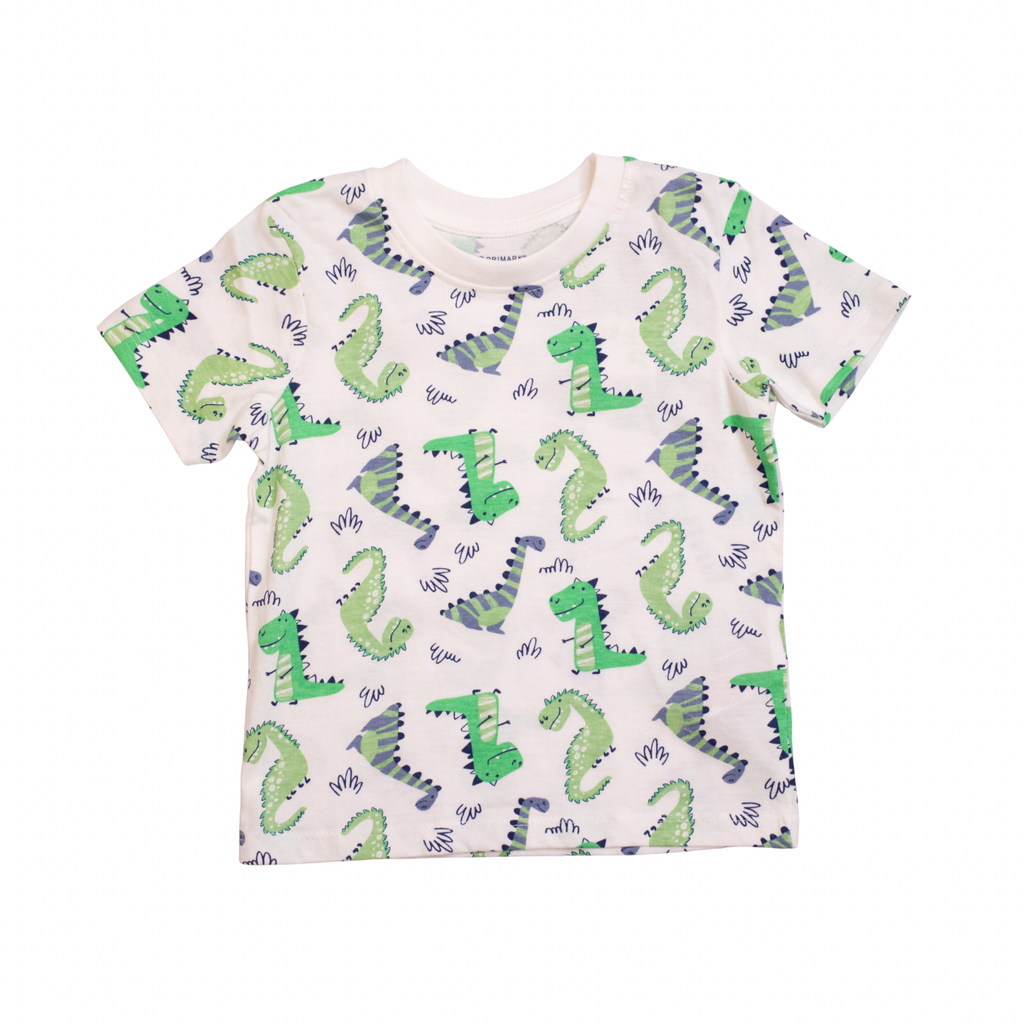 This boys cotton t-shirt features playful dino prints in green, perfect for little adventurers. Made from 100% cotton, it offers a soft, comfortable fit ideal for everyday wear and active play.