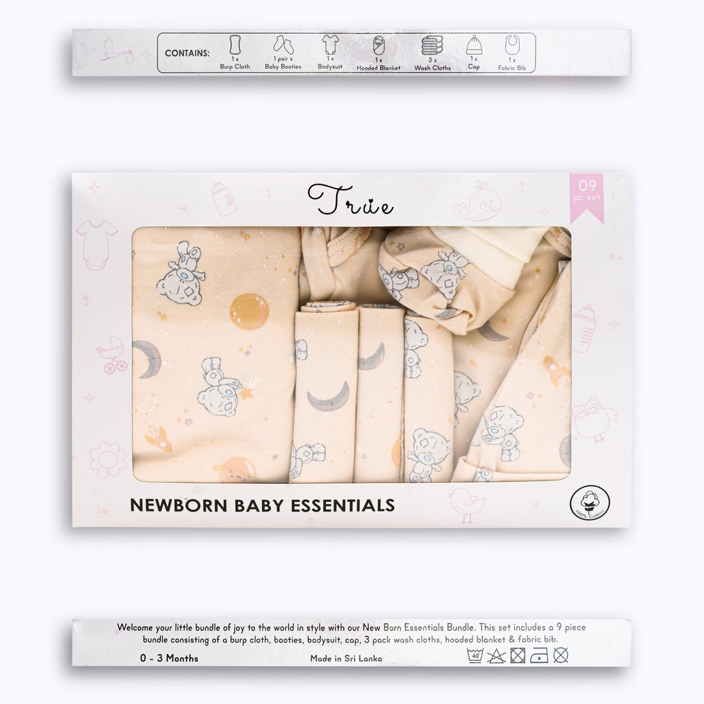 Welcome your newborn with this thoughtfully curated 9-piece essentials set designed to cover all the basics. This bundle includes cozy booties, a soft onesie, a cap, a hooded blanket, burp cloths, washcloths, and a fabric bib—everything you need to care for your baby comfortably and confidently. Say goodbye to last-minute worries; we’ve prepared this set to support you every step of the way. Easy to care for with gentle washing instructions to keep your baby’s items fresh and safe. Perfect for starting your little one’s journey with love and comfort.
