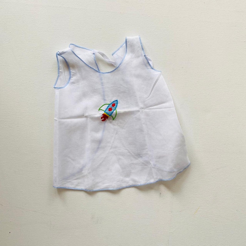 This newborn embroidered rocket shirt combines comfort with charm. Crafted from 100% cotton with delicate hand embroidery on the front, it offers breathable comfort for your baby's sensitive skin. The convenient tie-back design makes dressing your little one stress-free. Perfect for everyday wear from newborn to 3 months, this white and blue shirt creates adorable photo opportunities. Includes one baby shirt only. Care is simple—hand wash or machine wash cold (max 30°C) on delicate cycle with similar colors.