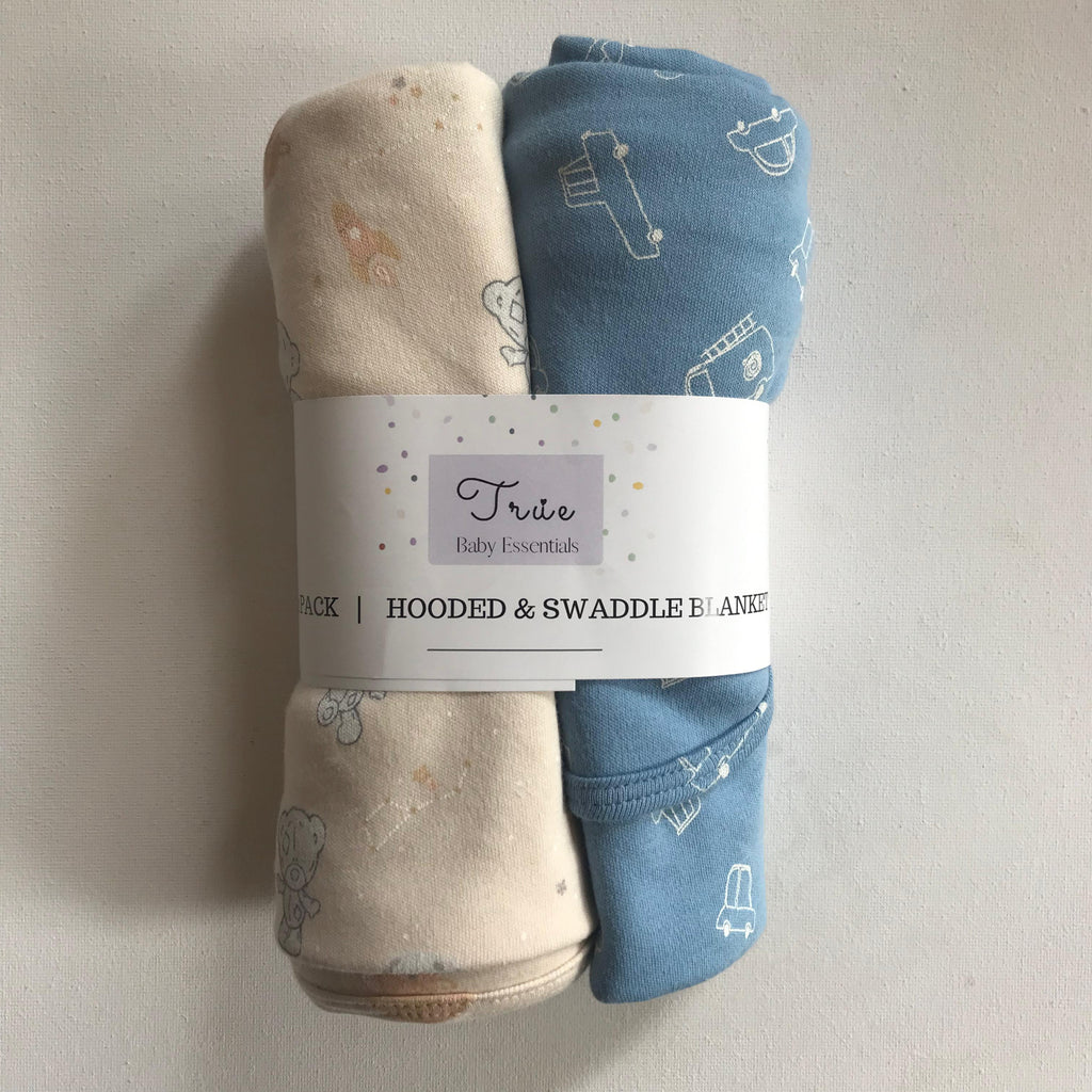 Baby Hooded & Swaddle Blanket 2 Pack - Blue Vechiles