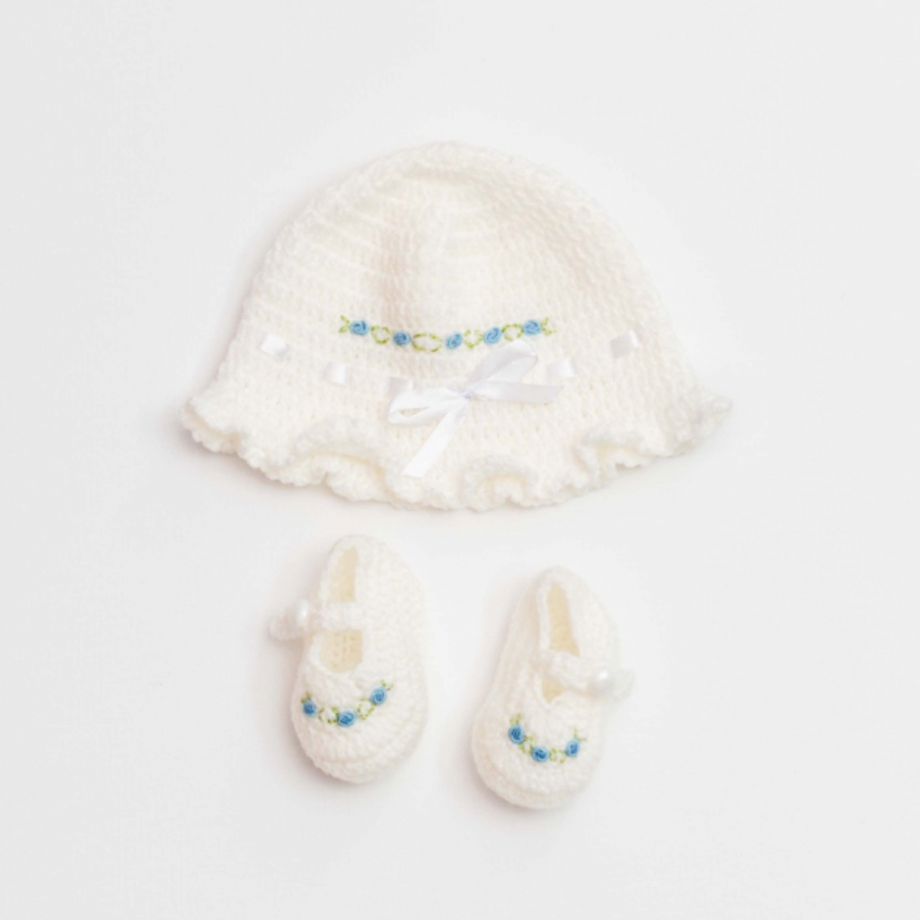 This Crochet Embroidered Cap + Booties Set is crafted by hand with intricate crochet and embroidery details. This newborn set is perfect for keeping your precious little one cozy and stylish all at the same time. Made with 100% cotton material, it provides comfort and durability for daily wear.
