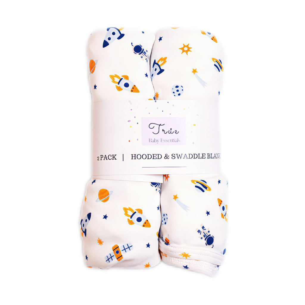 New Baby Hooded & Swaddle Blanket 2 Pack - Rocket Theme
