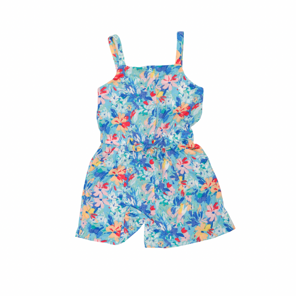 Girls Blue Floral Print Strap Soft Cotton Romper