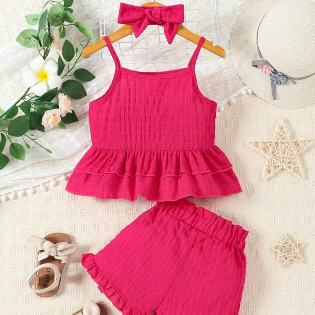 Elevate your little girl's summer wardrobe with our Girls Ruffle Hem Cami Top + Shorts & Headband set. Perfect for the summer, this set includes a stylish cami top, comfortable shorts, and a matching hairband. Let her stand out in bright pink and enjoy the warm weather in style..