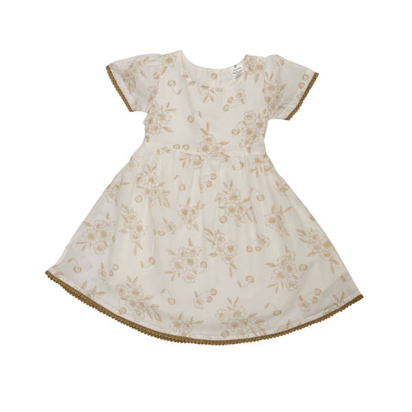 Girls Floral Print Cotton Dress - White & Brown