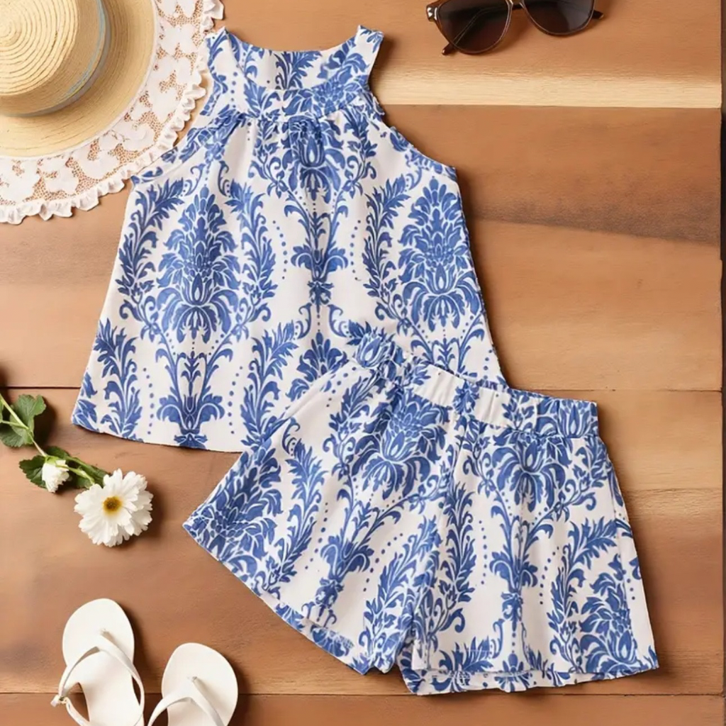 Elevate your casual wardrobe with this blue and white two-piece set featuring a sleeveless top with matching shorts.