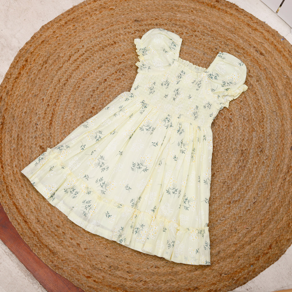 This summer floral smocked dress in yellow is the perfect addition to any girl's wardrobe. Made with soft and breathable cotton, it's perfect for warmer days. The smocked design adds a touch of elegance while providing a comfortable and flattering fit.
