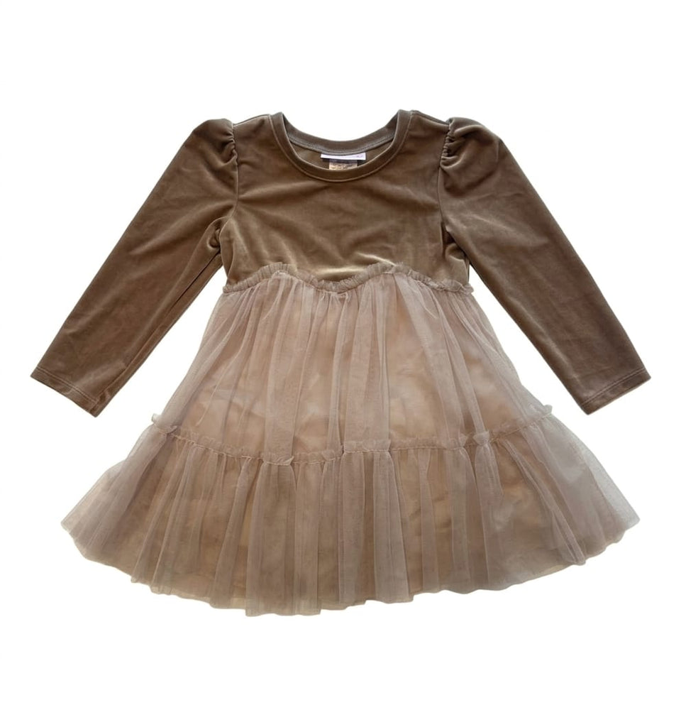 Girls Long Sleeve Velvet & Tulle Party Dress - Camel Gold