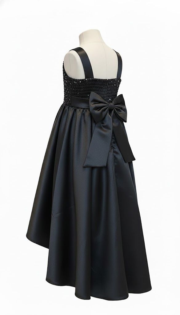 Let your child shine at every celebration with this elegant satin party dress. Crafted from luxurious satin fabric with shimmering sparkly embellishments, the dress features delicate mesh detailing that adds sophistication and movement. The classic black color ensures versatility for any occasion—from birthday parties to formal events. The satin finish provides a polished, refined look while remaining comfortable for all-day wear. Perfect for creating memorable moments in style.