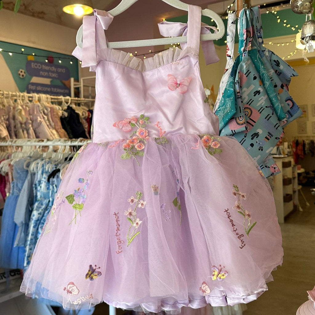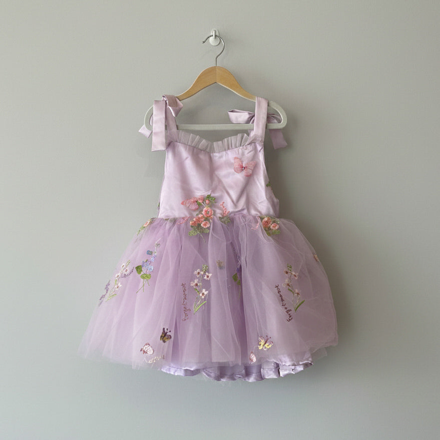 Bring a little magic to her wardrobe with this dreamy pastel-lavender dress, featuring delicate floral embroidery, soft tulle layers, and charming bow-tie straps. Perfect for birthdays, photoshoots, or any special moment, this whimsical design adds a fairy-tale touch while keeping her comfy and cute all day long.