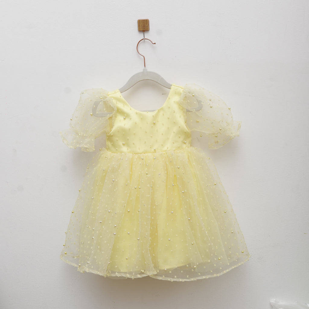 Girls Yellow Puff Sleeve Tulle Party Dress With Pearl Detail
