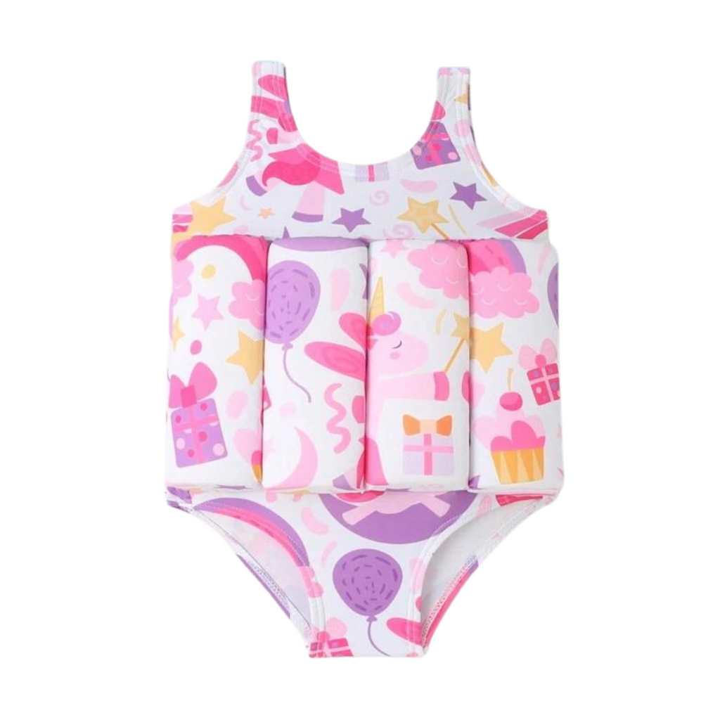 Baby Girl One Piece Floating Swim Suit in White & Pink Unicorn Print