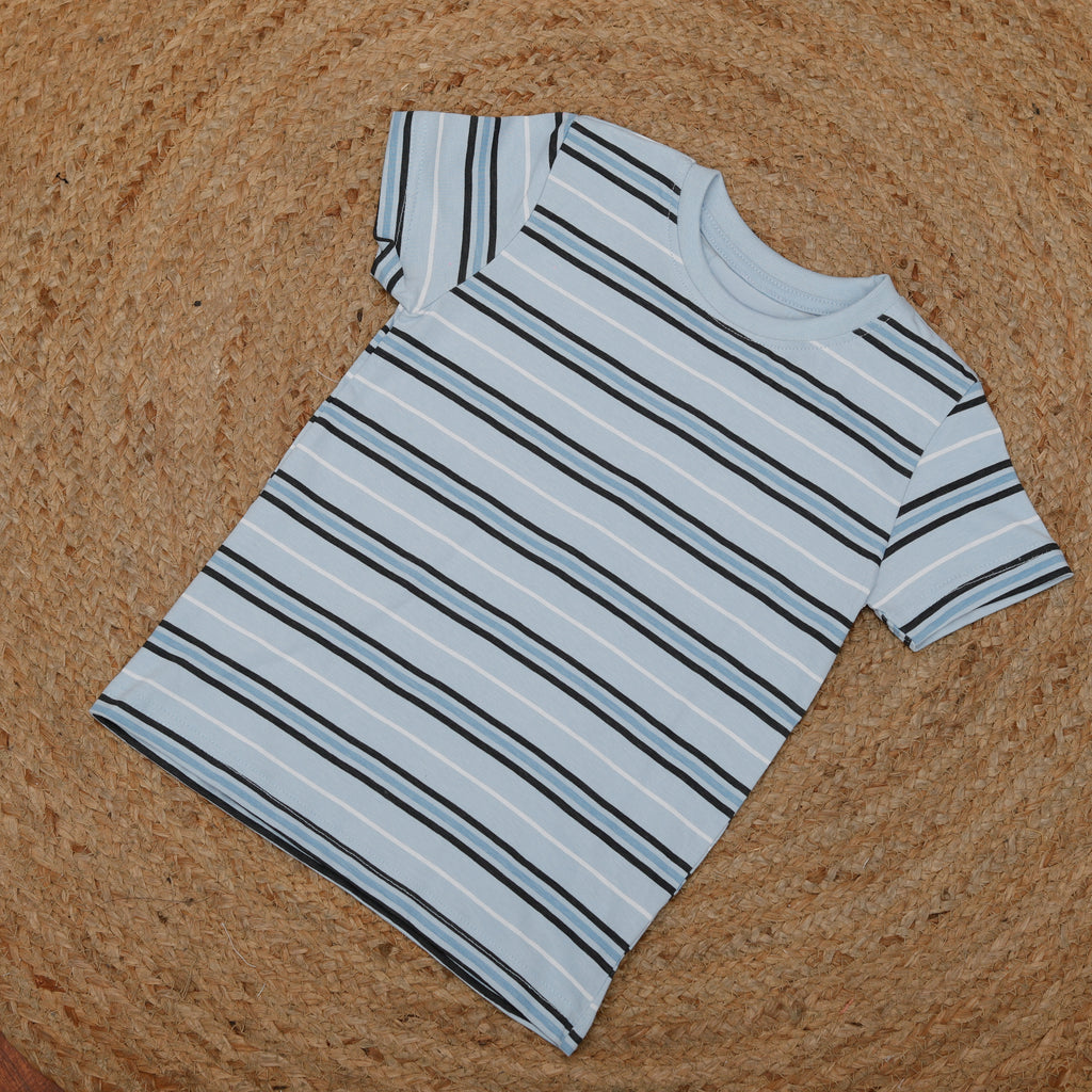 This boys' cotton t-shirt showcases a trendy light and dark blue stripe pattern, blending style with comfort effortlessly. Made from soft, breathable fabric, it keeps your child comfortable throughout the day while adding a cool, fashionable touch to their look. Ideal for everyday wear, this t-shirt is a smart choice for both style and ease.