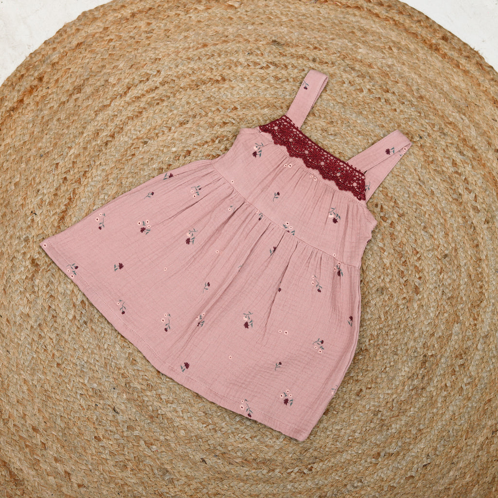 Baby Girl Muslin Embroidered Floral Dress - Red & Pink