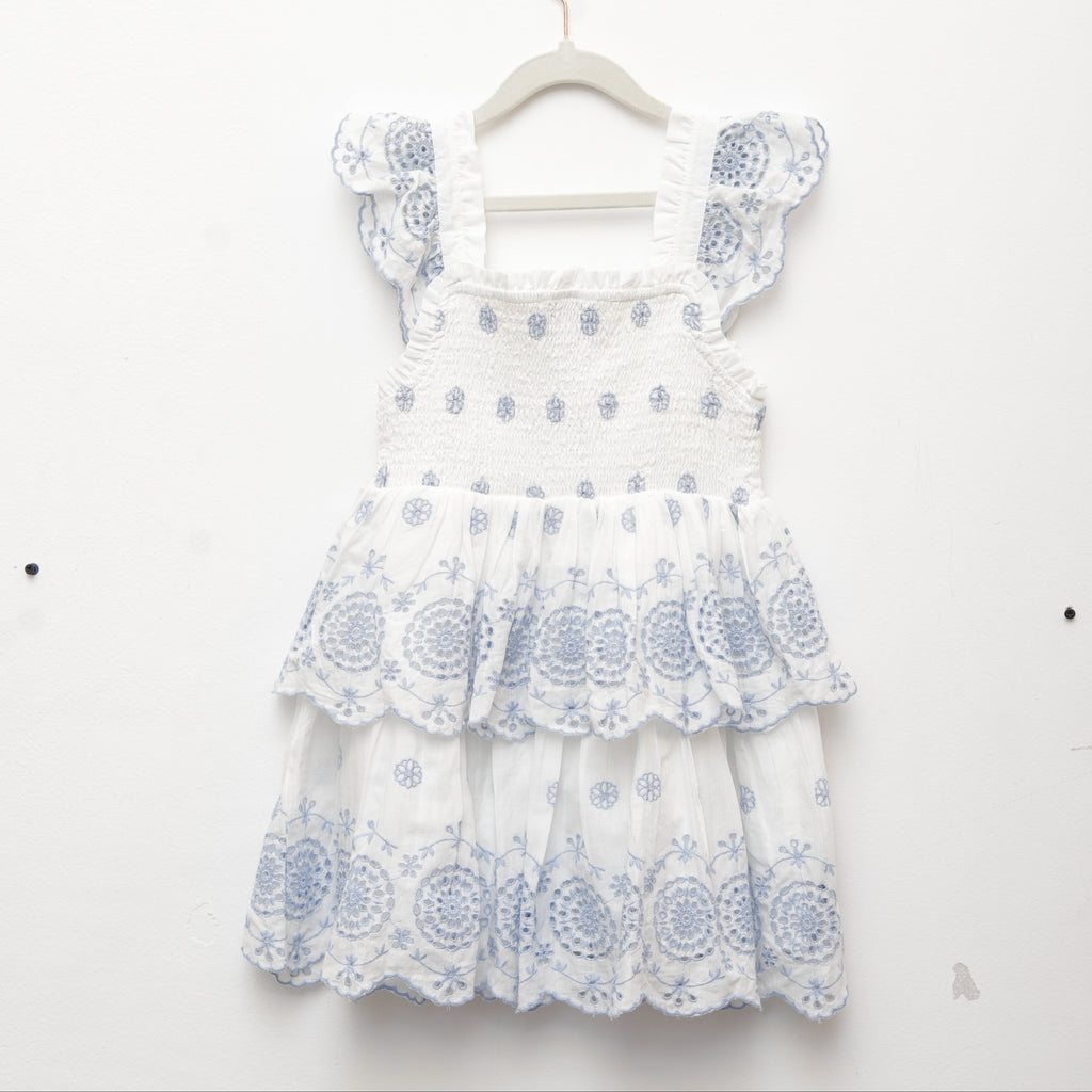 Girls Summer Cutwork Embroidered Dress - Blue & White