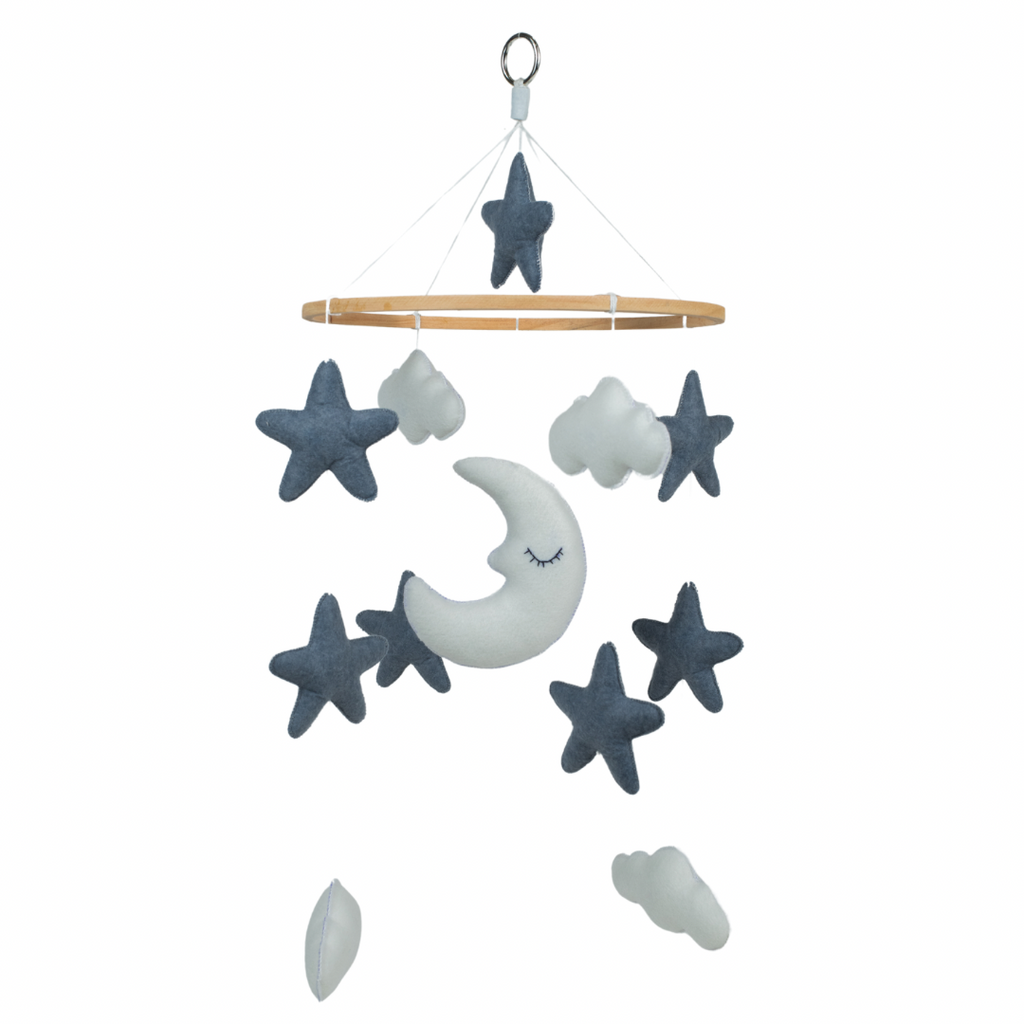 This beautifully handcrafted mobile, featuring a moon, stars, and clouds, is a perfect nursery decoration and a thoughtful gift for newborns. Made from felt and wood with fair trade and sustainable practices, it includes a metal loop for easy hanging on most crib arms (arm not included). Please remember, this mobile is for decoration only and not a toy—keep it out of reach of small children. Colors may vary slightly due to screen differences. For maintenance, spot clean only.