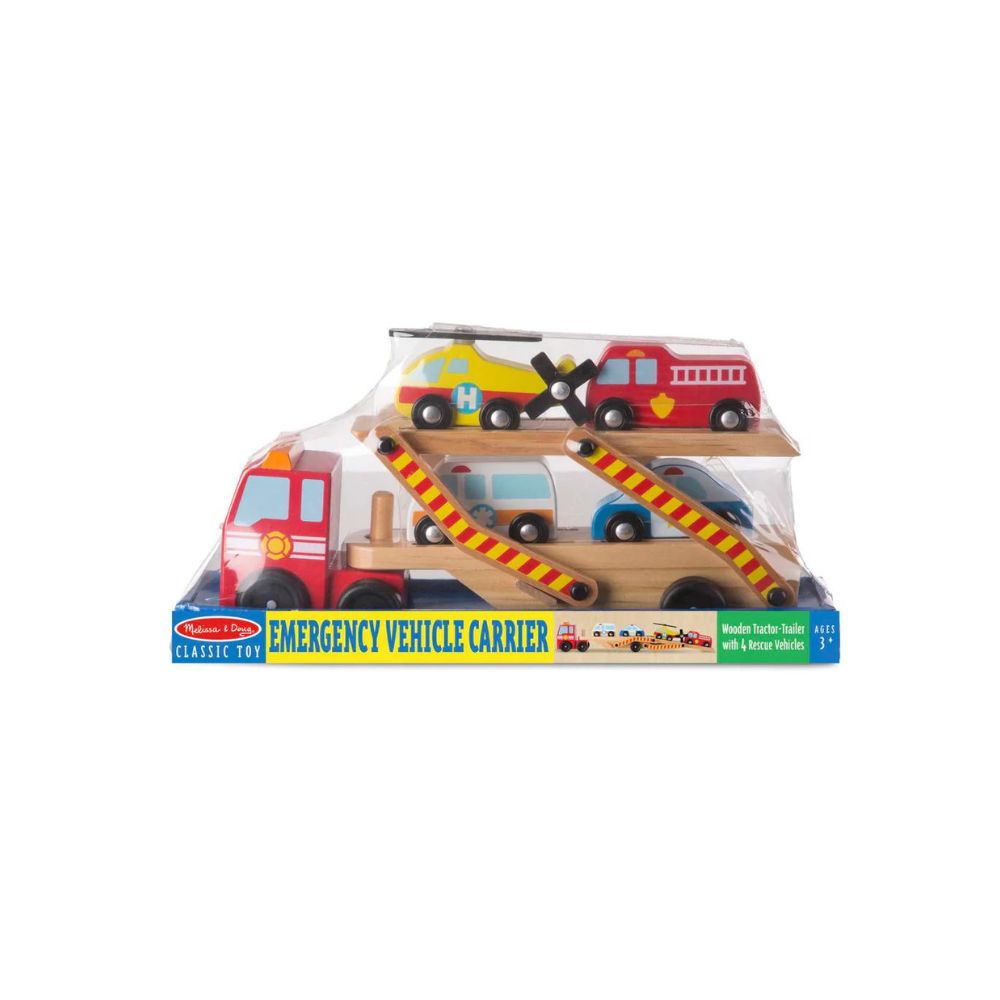This giant two-level tractor-trailer comes stocked with four wooden emergency vehicles and delivers unlimited play possibilities! Lower the upper deck to extend the truck to nearly two feet long and to allow the vehicles to roll off and race to the rescue. There’s a helicopter with rotating blade, a fire engine, police car, and ambulance, so kids can respond to any imaginative emergency. Classic design and sturdy construction is sure to last through years of hands-on play, and smoothly moving parts help kids three and older develop fine motor skills, movement, and hand-eye coordination.