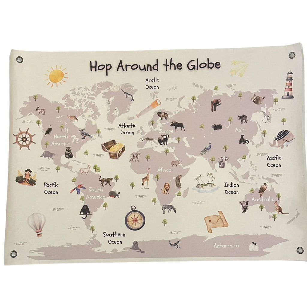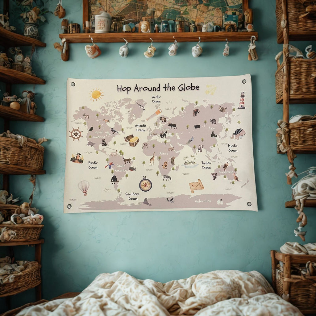 Inspire wanderlust and geographical curiosity with this hand-painted Hop Around The Globe Banner. Crafted on premium canvas paper, each continent and destination is rendered with artistic detail, transforming learning into a visual adventure. This educational piece encourages children to explore world geography, cultures, and landmarks while developing spatial awareness. Ideal for classrooms, nurseries, or travel-themed spaces, it combines authentic handmade artistry with meaningful educational content that sparks imagination and global awareness.