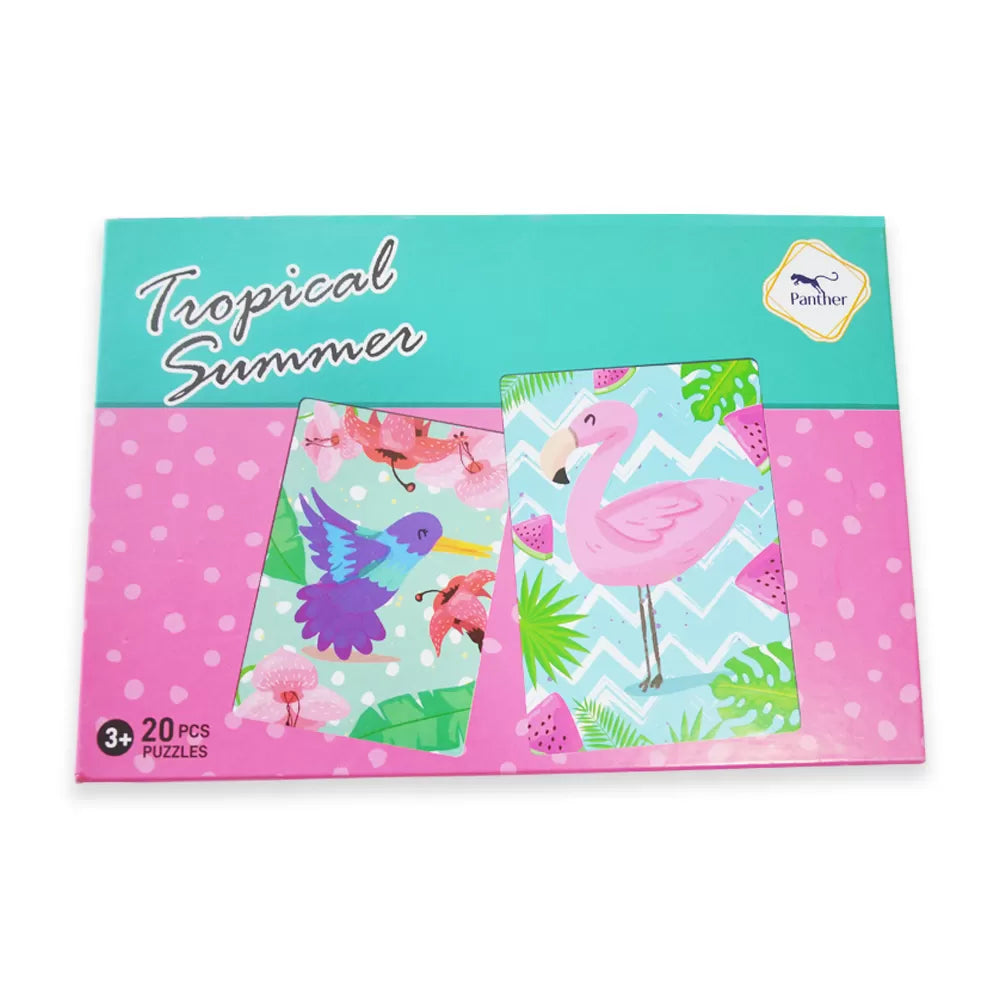 There are two puzzles in the box. Each Tropical Puzzle has 20 pieces and is a great way to keep a child busy. By assembling a puzzle, the child learns about how a pattern works and sharpens their fine motor skills. The two puzzles have a solid color on the back of the puzzle so when a child breaks it up they can separate the puzzle pieces of each one.