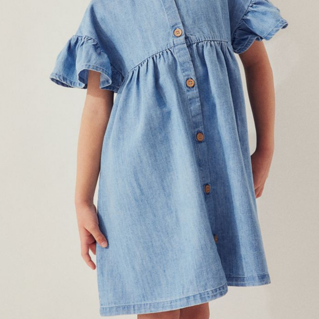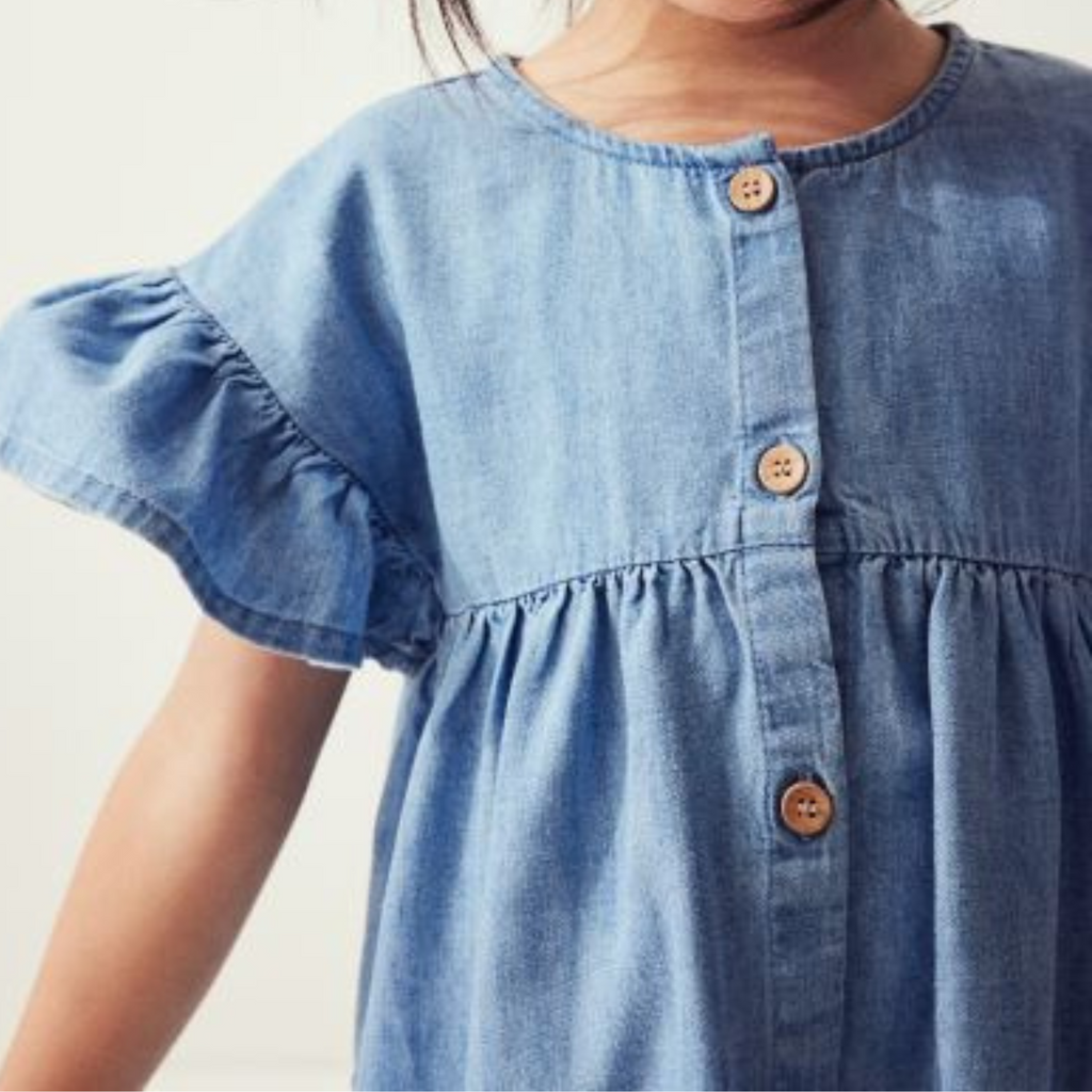 - Empire-line dress in a soft weave with flutter sleeves and buttons down the front.