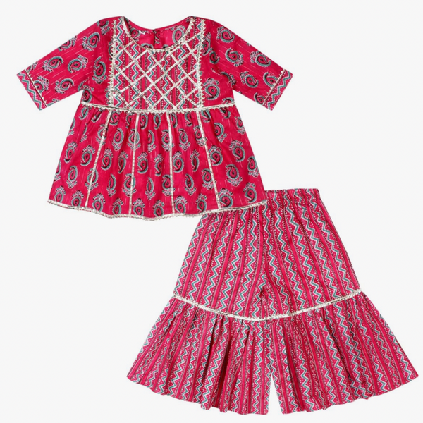 Girl’s Pink Print Anarkali Kurta Sharara Set