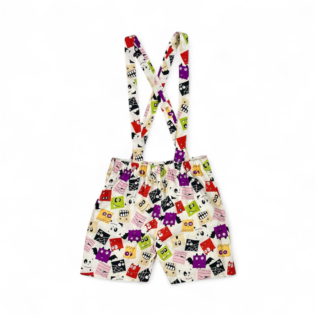 This boy’s suspender shorts feature a playful Halloween monster print, adding a fun and festive touch to any outfit. Perfect for casual wear or costume-themed occasions, this piece combines comfort with a spooky-cute design kids will love.