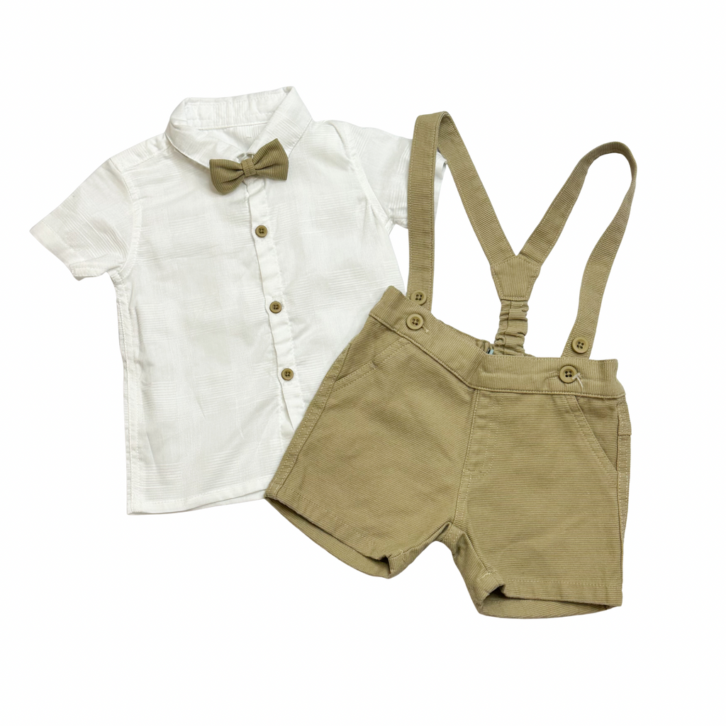 Baby Boy Beige & White Cotton Shirt + Suspender Party Outfit with Bow Tie