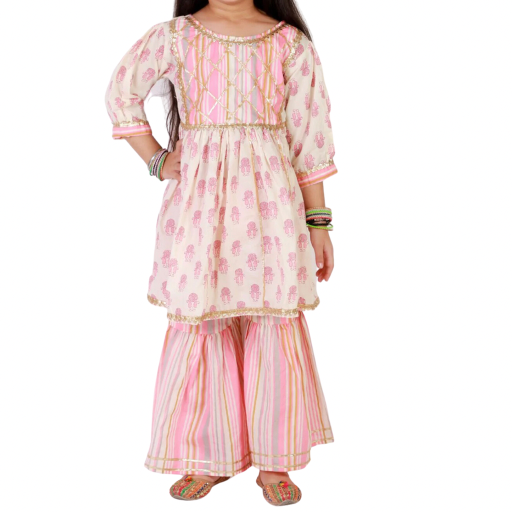 Dress your little princess in this charming Pale Pink Anarkali Kurta Sharara Set designed especially for infant girls. This delightful ethnic ensemble offers both comfort and style for festive occasions. Crafted from 100% cotton, this traditional outfit ensures your little one stays comfortable while looking adorable. The perfect choice to make your baby girl shine during special celebrations.