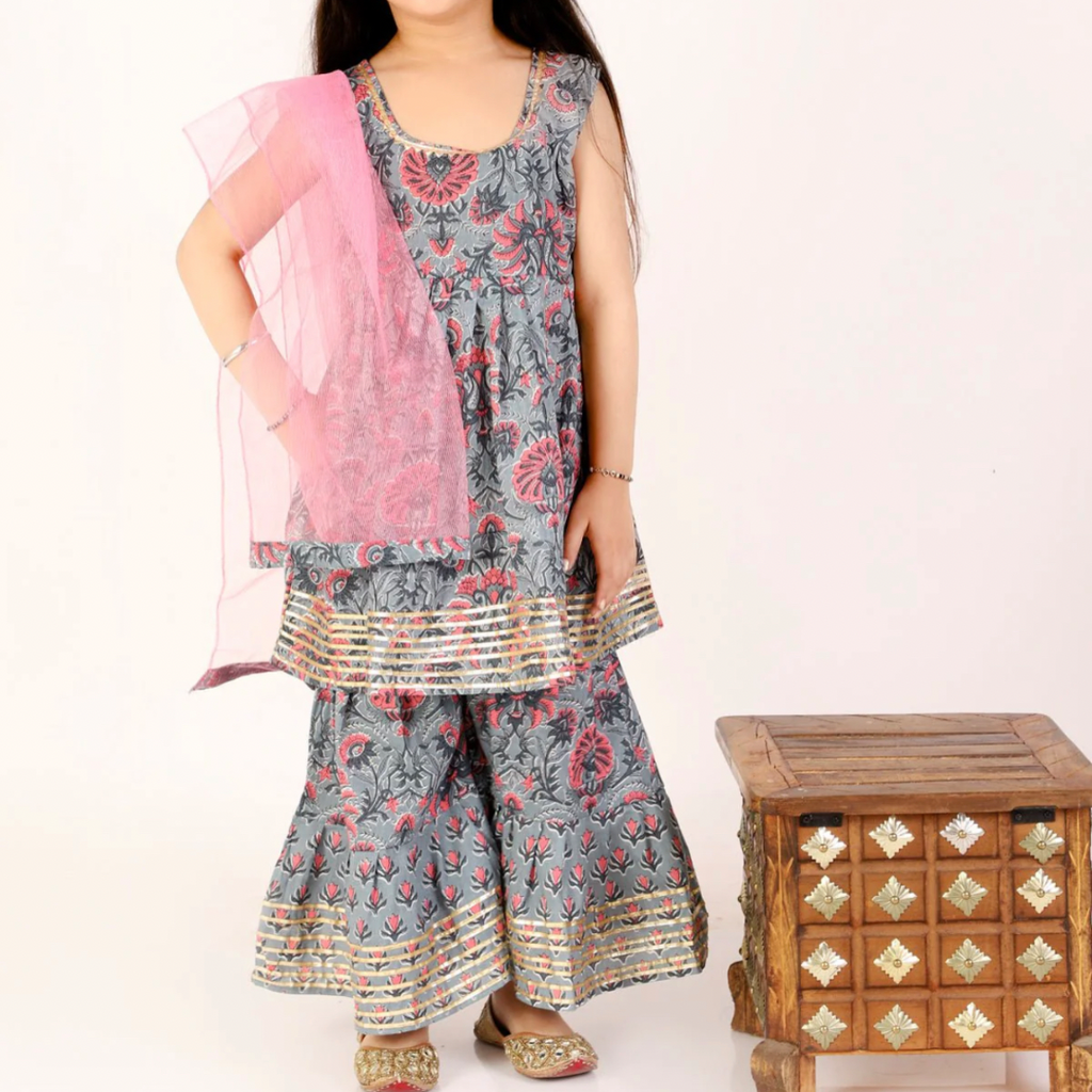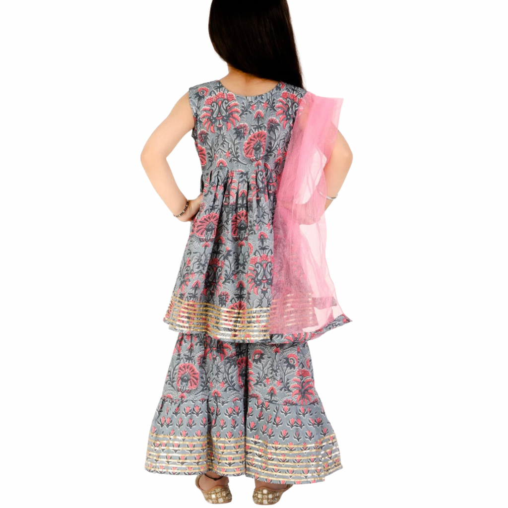 Dress your little princess in this charming Grey Floral Print Anarkali Kurta Sharara Set with Dupatta. Crafted from 100% cotton, this beautiful ethnic ensemble ensures comfort while celebrating festivals and special occasions. The traditional design offers both style and ease, making it an ideal festive outfit for your precious daughter to shine in cultural gatherings.