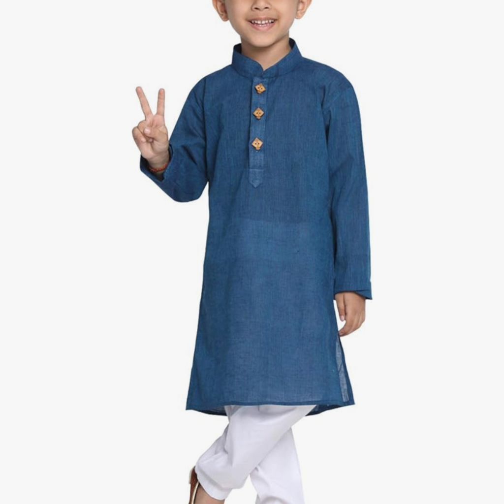 Treat your son to this adorable Mandarin Collar Midnight Blue Boys Kurta Pajama Set for the upcoming celebrations. This comfortable ethnic outfit allows kids to enjoy festivities without restriction. Crafted from soft cotton with an easy-to-wear drawstring pajama, your little gentleman will be delighted with his stylish traditional attire. For longevity, avoid bleach and opt for dry cleaning or gentle cold washing to maintain its fresh appearance.