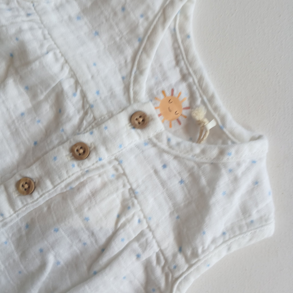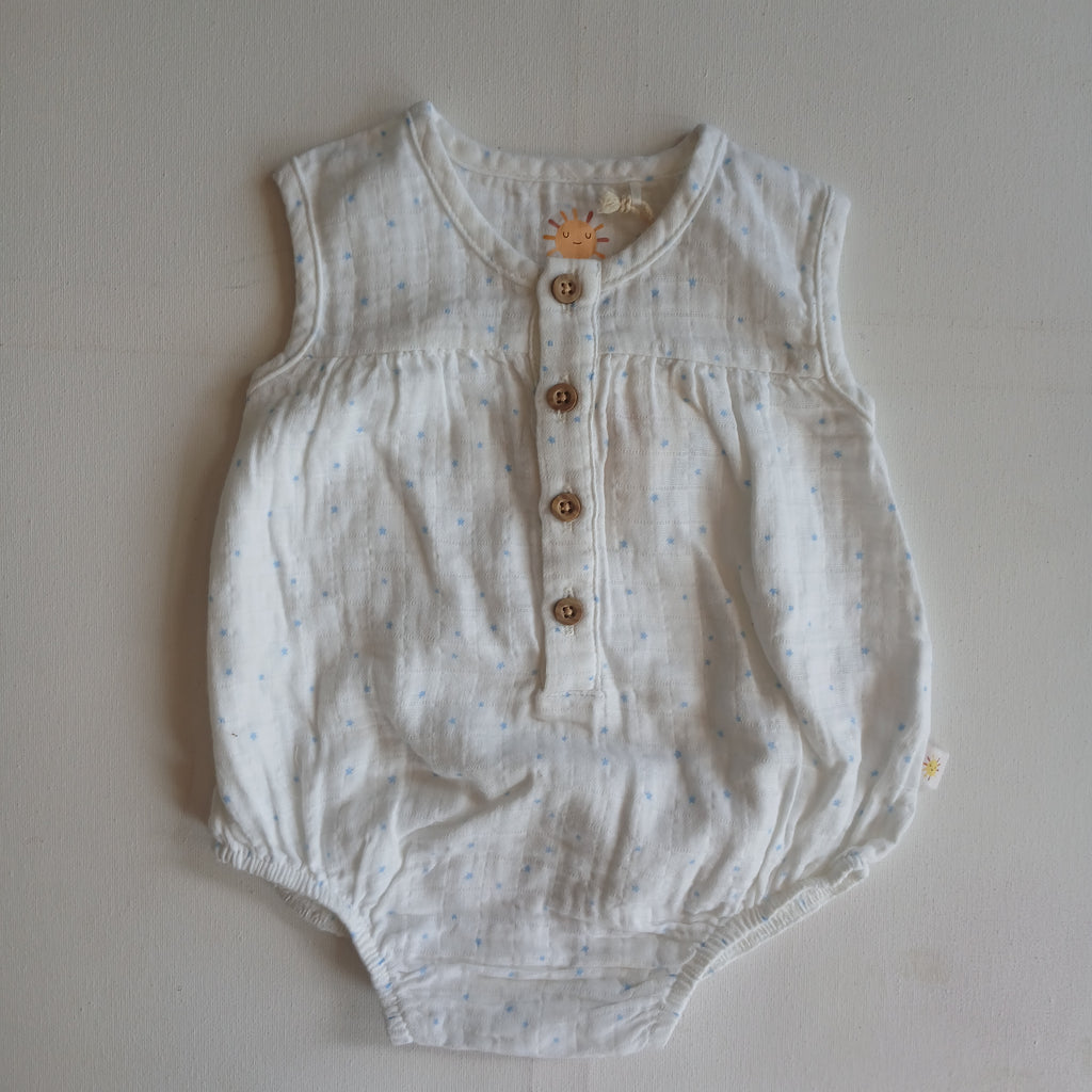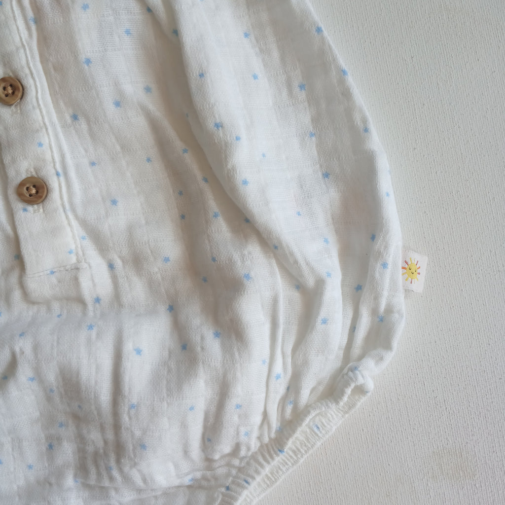 This Kids Muslin Bodysuit made from soft and breathable muslin material is perfect for your little one's delicate skin. With the adorable blue star design, your child will look stylish and feel comfortable all day long. The lightweight fabric also provides natural temperature control, making it ideal for any season.