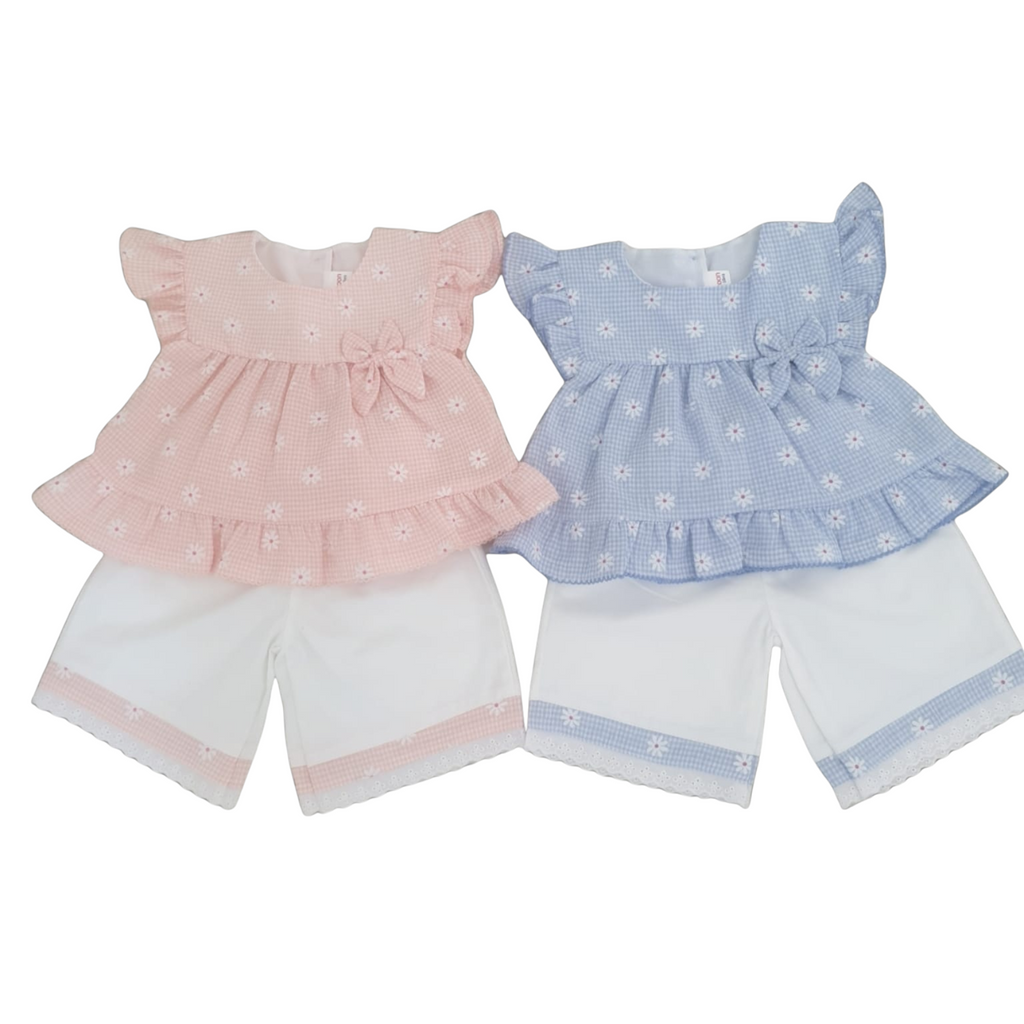 Infant Baby Girl Daisy Top & Shorts Co-ord Set in Blue & Pink Options