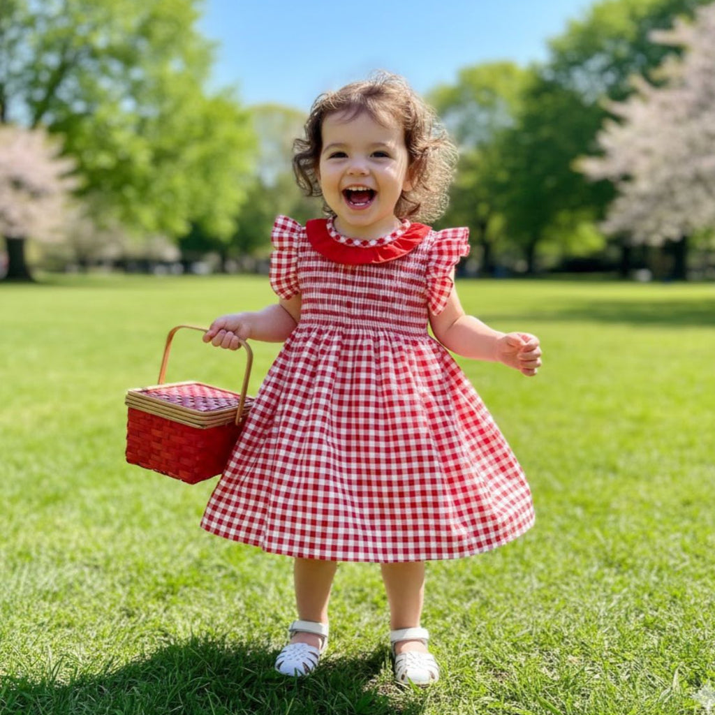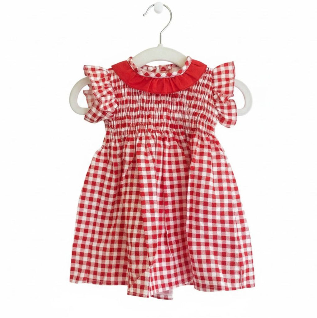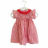 This sophisticated smocked red check frock showcases meticulous attention to detail with its hand-finished smocking across the bodice, creating elegant gathering and dimensional texture. The vibrant red gingham pattern delivers classic charm with modern versatility, while short sleeves offer practical comfort for year-round wear. The structured smocking technique not only enhances the silhouette but also provides gentle shaping through the torso. Ideal for those who appreciate quality construction and timeless design, this piece seamlessly transitions from casual daywear to polished evening occasions with minimal styling effort.