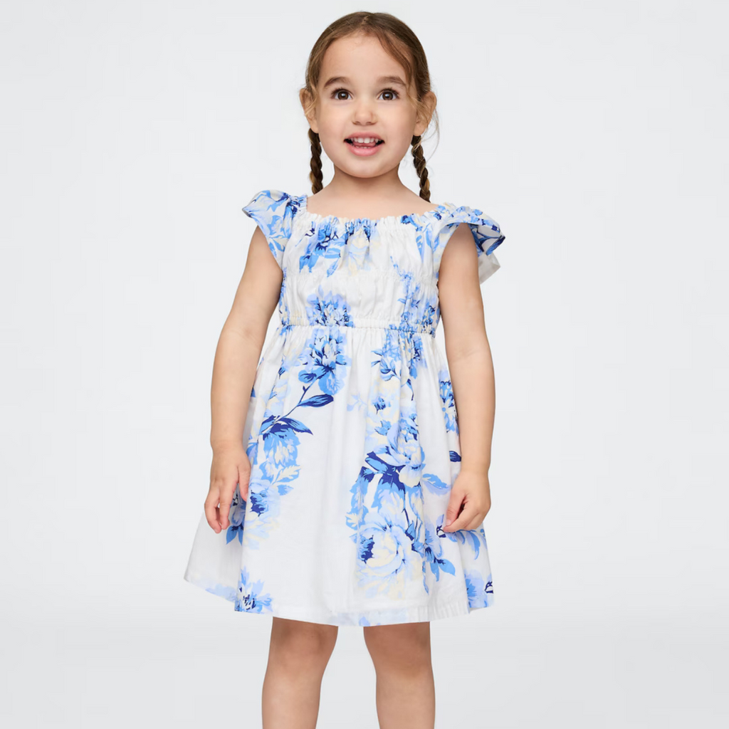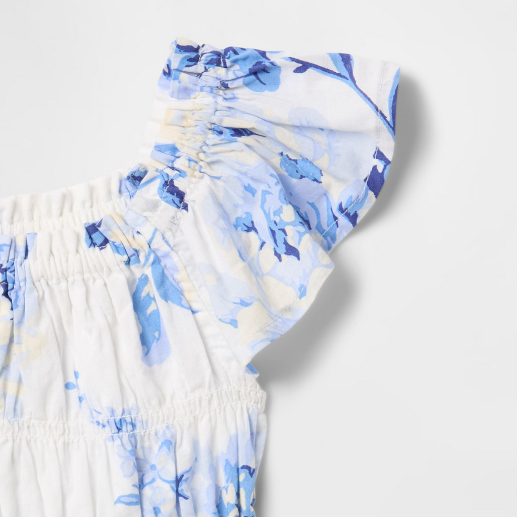 Baby Girl Cotton White Blue Floral Frill Flutter Sleeve Dress