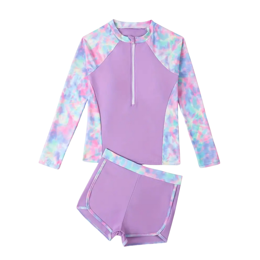 Girls 2 Piece Long Sleeve Tie Die Purple Print Rashguard Swimsuit with Swim Shorts