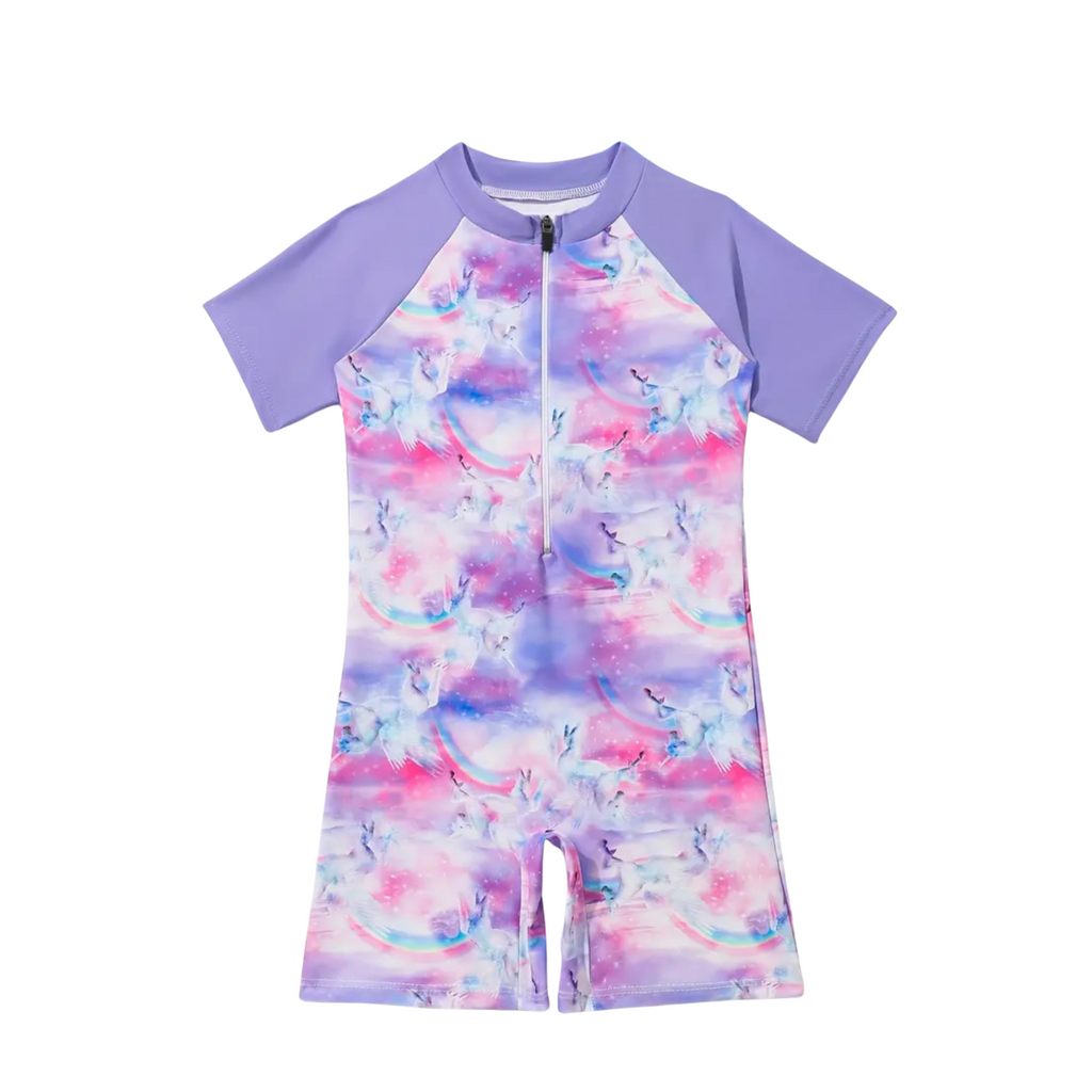 This long sleeve swim suit in a fun purple pattern is the perfect choice for your little one's next beach or pool adventure.