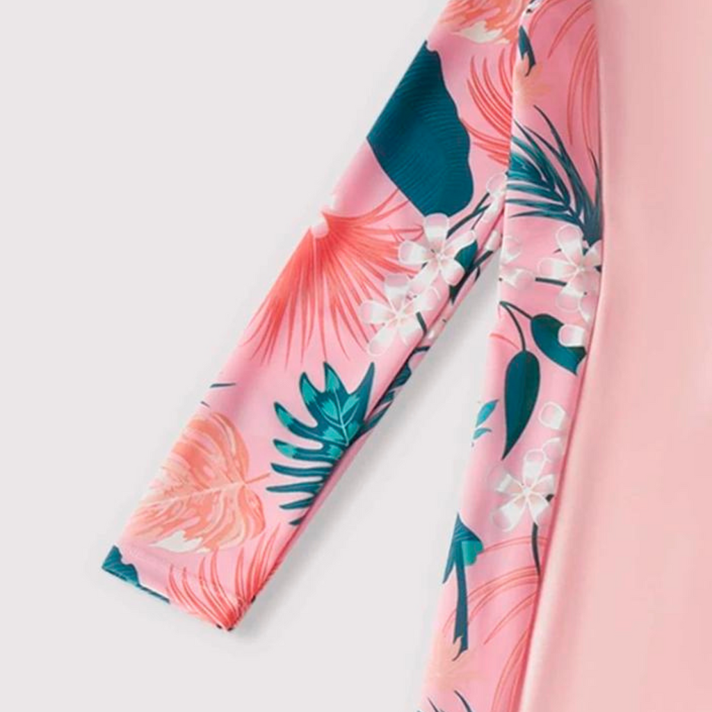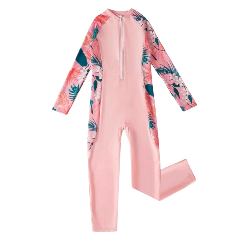 Kids Long Sleeve Rash Guard Zipper Front Full Swim Suit - Peach & Tropical