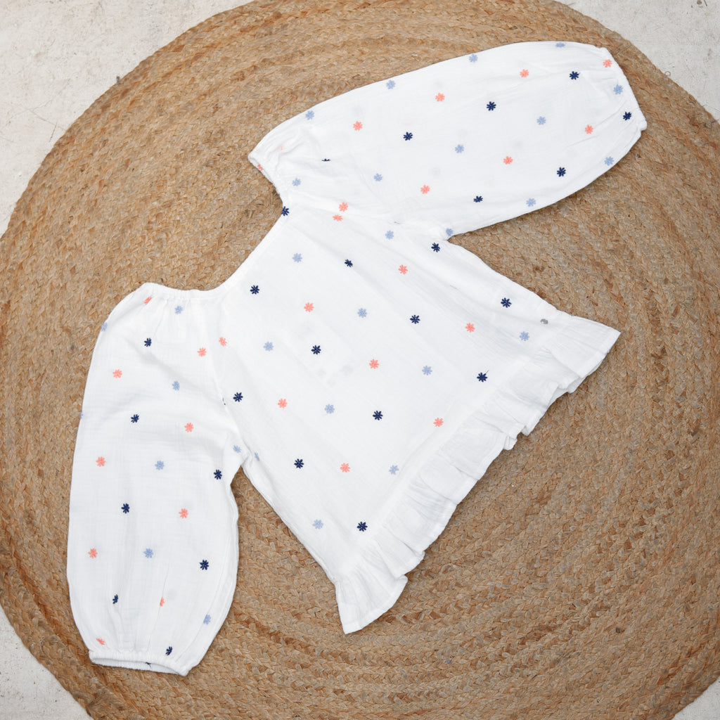 Girls White Flower Patch Puff Long Sleeve Crop Top