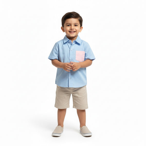 Boys Short Sleeve Cotton Shirt - Blue with Pink Pocket