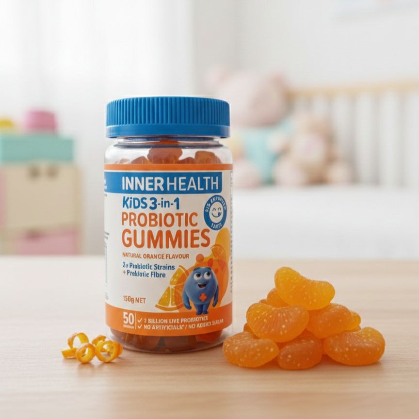 Not only are these gummies fun & tasty, but they also contain two probiotic strains plus a prebiotic to support your litte one's health. Inner Health Kids 3-in-1 Probiotic Gummies: