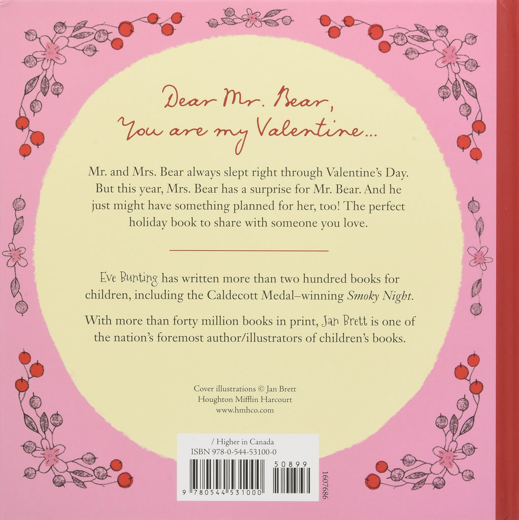 In this book by Eve Bunting, Mr. and Mrs. Bear settle down to hibernate for the winter. Mrs. Bear, however, sets her alarm clock for February 14, so that she and Mr. Bear can celebrate Valentine's Day together for the first time (they usually sleep right through it). She gets up in February, completes her preparations, and then wakes up Mr. Bear to celebrate together.