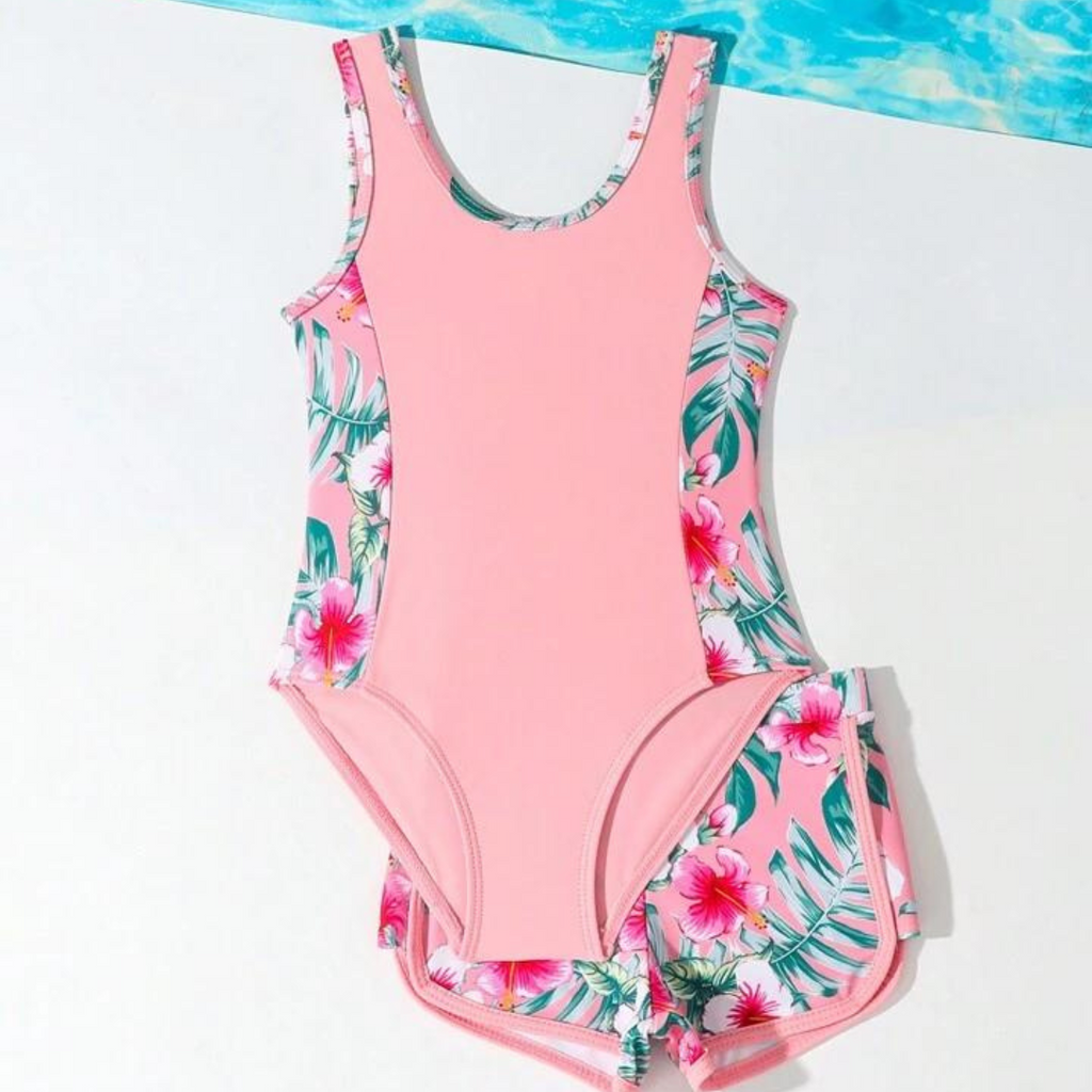 2 Pack Pink Floral One Piece Swimsuit with Shorts for Girls
