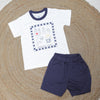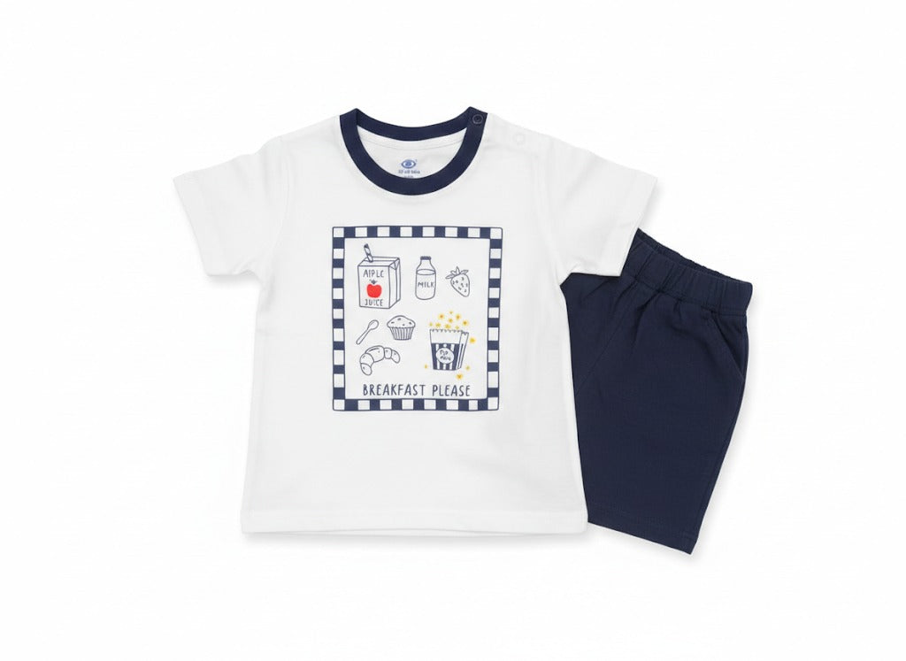 Start his day with a playful look in this Toddler Boys’ "Breakfast Please" T-Shirt and Shorts Set, designed for both comfort and charm. This two-piece outfit features a crisp white short-sleeve tee with a bold blue contrast crew neck and a delightful "Breakfast Please" graphic showcasing fun food illustrations—like milk, croissants, and apple juice inside a blue checkered border. Paired with vibrant dark blue shorts that offer an easy-to-wear elastic waistband and functional side pockets for storing tiny treasures, this set is perfect for active mornings and casual play. Made for little explorers who love their snacks and their style, this coordinated set is a fresh and durable addition to any toddler's wardrobe.