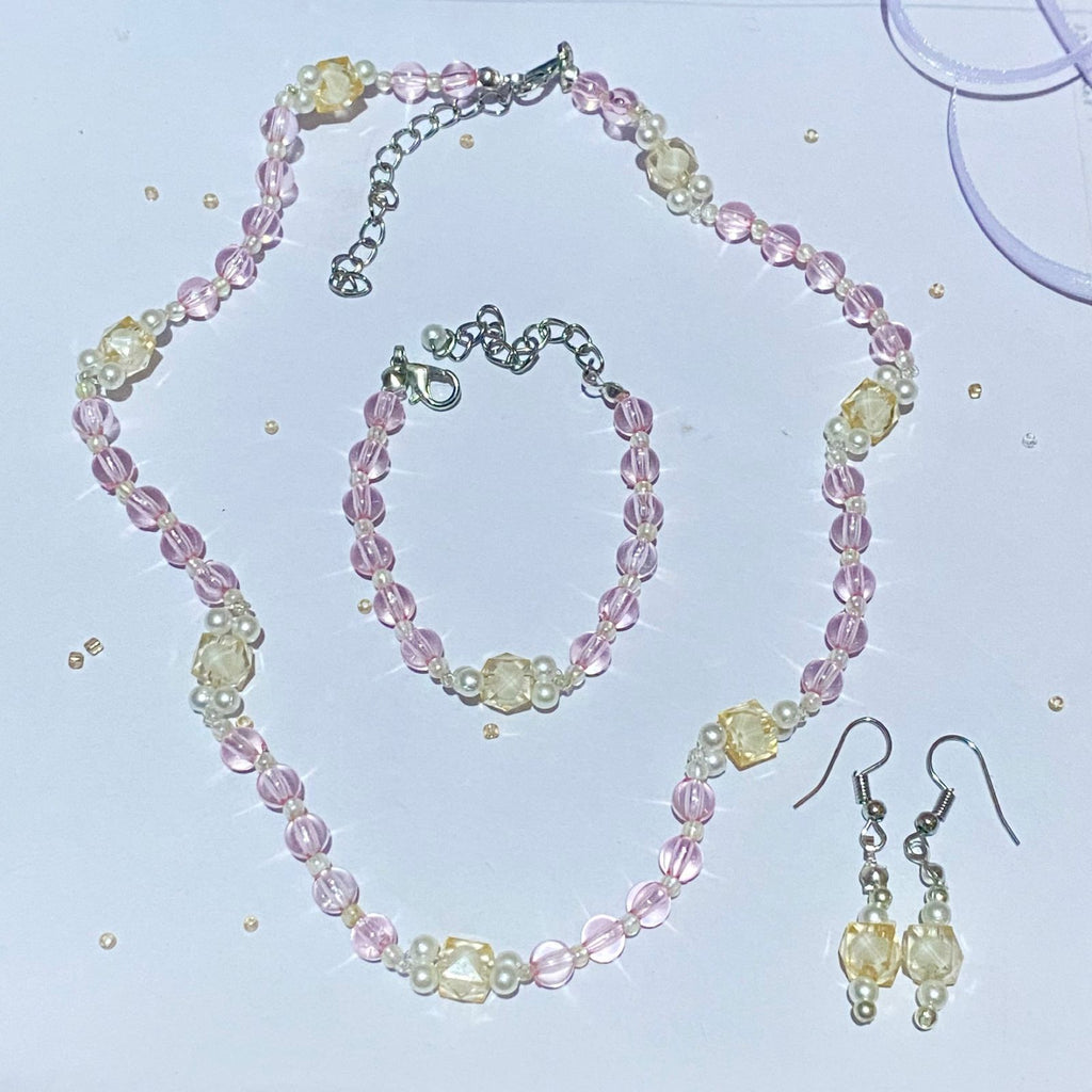Looking for the perfect gift? Look no further! The blushing shimmer set includes a beautiful bracelet, necklace, and earrings, making it the perfect set for any occasion. With its delicate and elegant design, it's sure to make anyone blush. Treat yourself or a loved one to a touch of shimmer and sparkle.