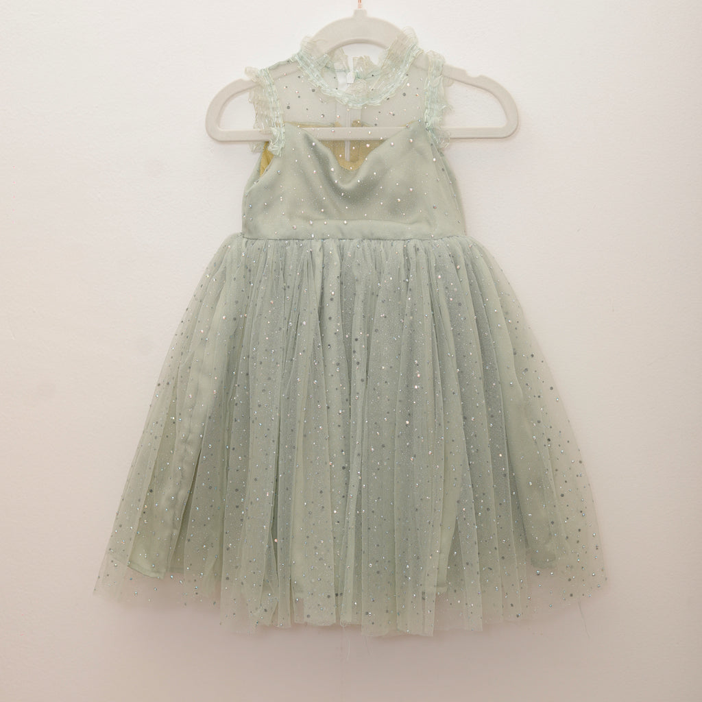 This beautiful handmade dress features a delicate green shimmer net fabric, sure to make your baby girl stand out in any occasion.