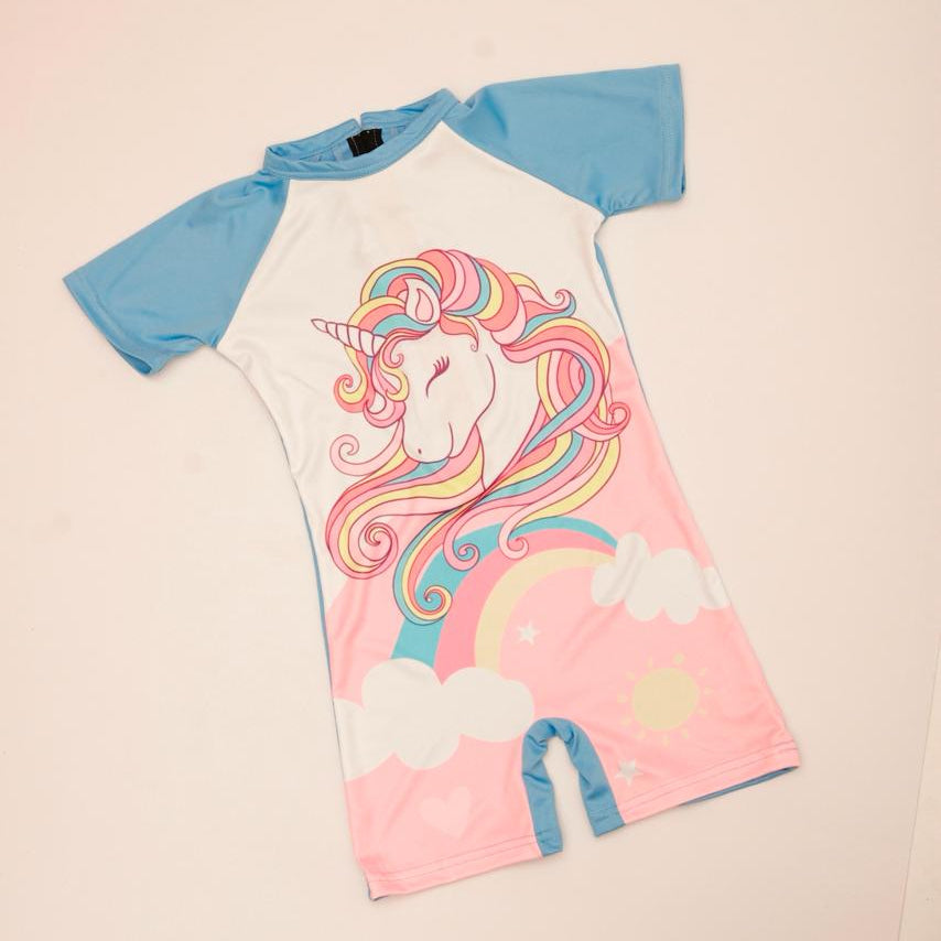Featuring a magical unicorn print, pastel rainbow colors, and comfy short sleeves - this swimsuit keeps your little one cute, confident, and protected for all-day fun in the sun. Perfect for beach days, pool parties, and summer adventures! 🌈💦
