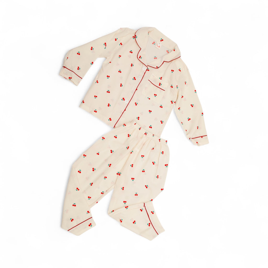 Drift off to sweet dreams in the exquisite Girls Cherry Blossom Pajamas. This beautiful sleep set features a light, breathable fabric adorned with a gentle print of delicate cherry blossoms and softly cascading petals. The classic pajama shirt and coordinating shorts are trimmed with subtle piping for a timeless, tailored look. Perfect for spring and summer nights, these pajamas bring a touch of peaceful elegance and comfort to her bedtime routine.