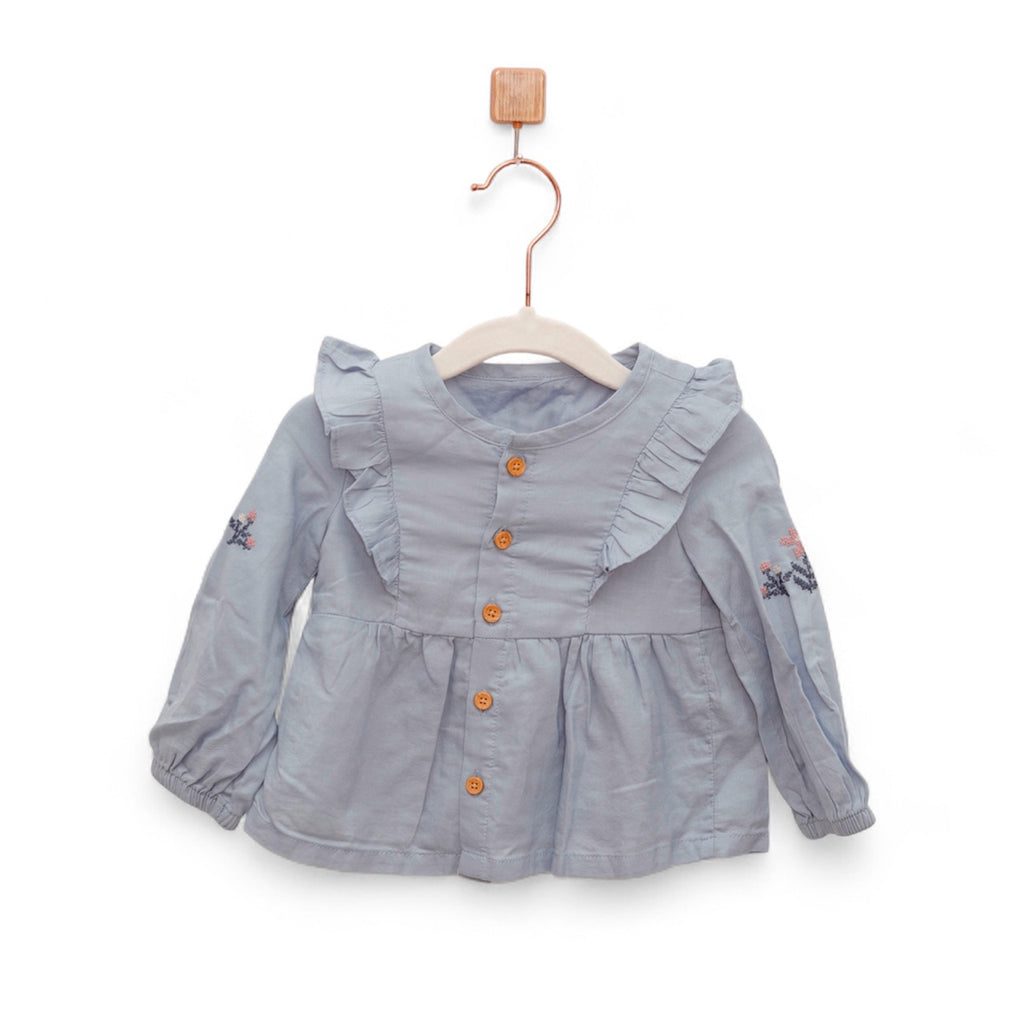 Elevate her everyday look with this charming and comfortable Girls Long Sleeve Ruffle Blouse. Crafted from a soft, lightweight fabric in a lovely light blue/grey hue, this top is designed for both style and ease of movement. The standout feature is the delicate ruffle trim that runs across the chest and shoulders, perfectly complemented by beautiful floral embroidery detailing on the sleeves. Finished with sweet, contrast wooden buttons down the front, this blouse is perfect for pairing with leggings or skirts for any casual or special occasion.